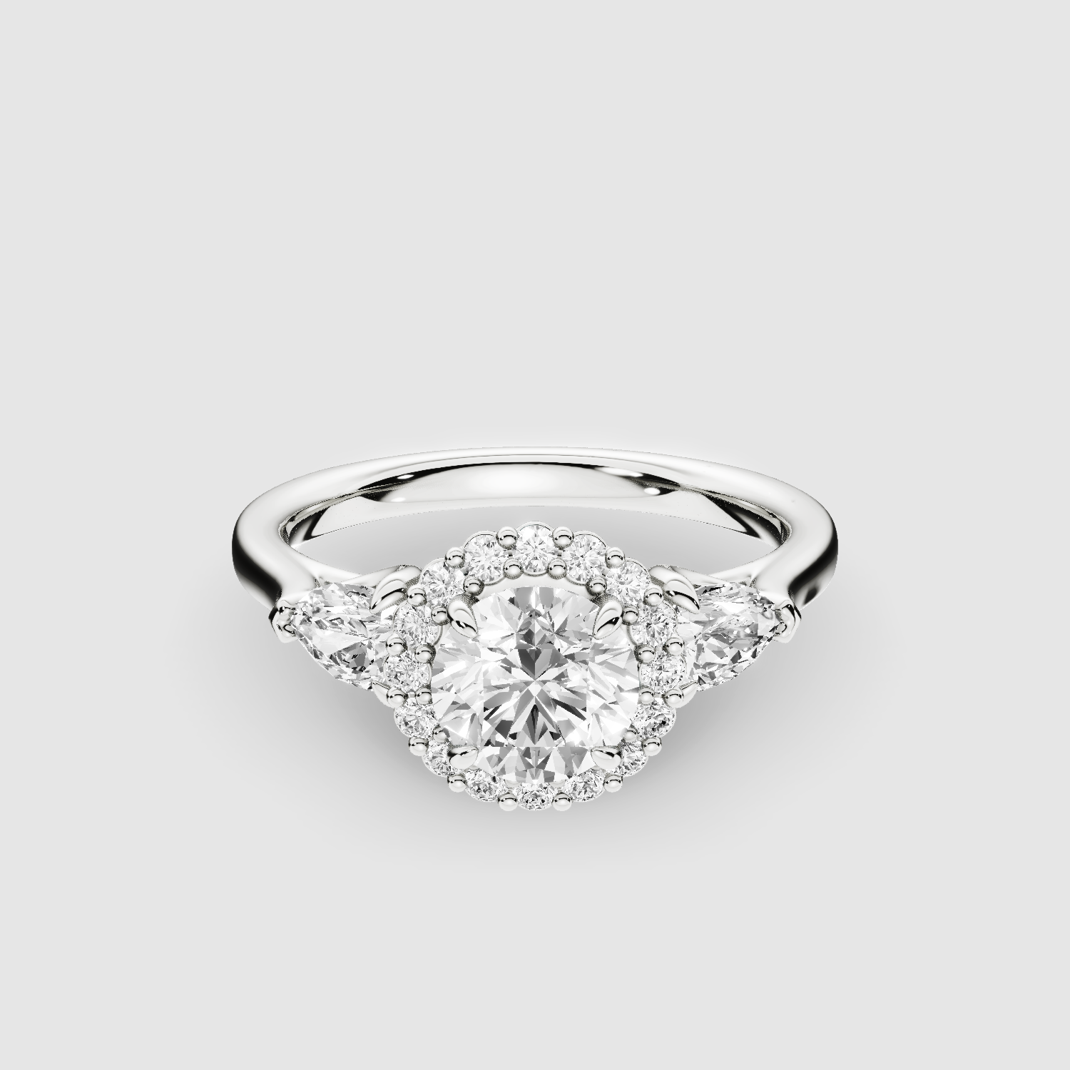 The sparkle of love is reflected by this three-stone, lab-grown diamond engagement ring. The central solitaire's appeal is enhanced by a pear-shaped diamond on either side. The iconic 'Diana Halo' and its shadow wink glamorously, adding radiance to the ring.