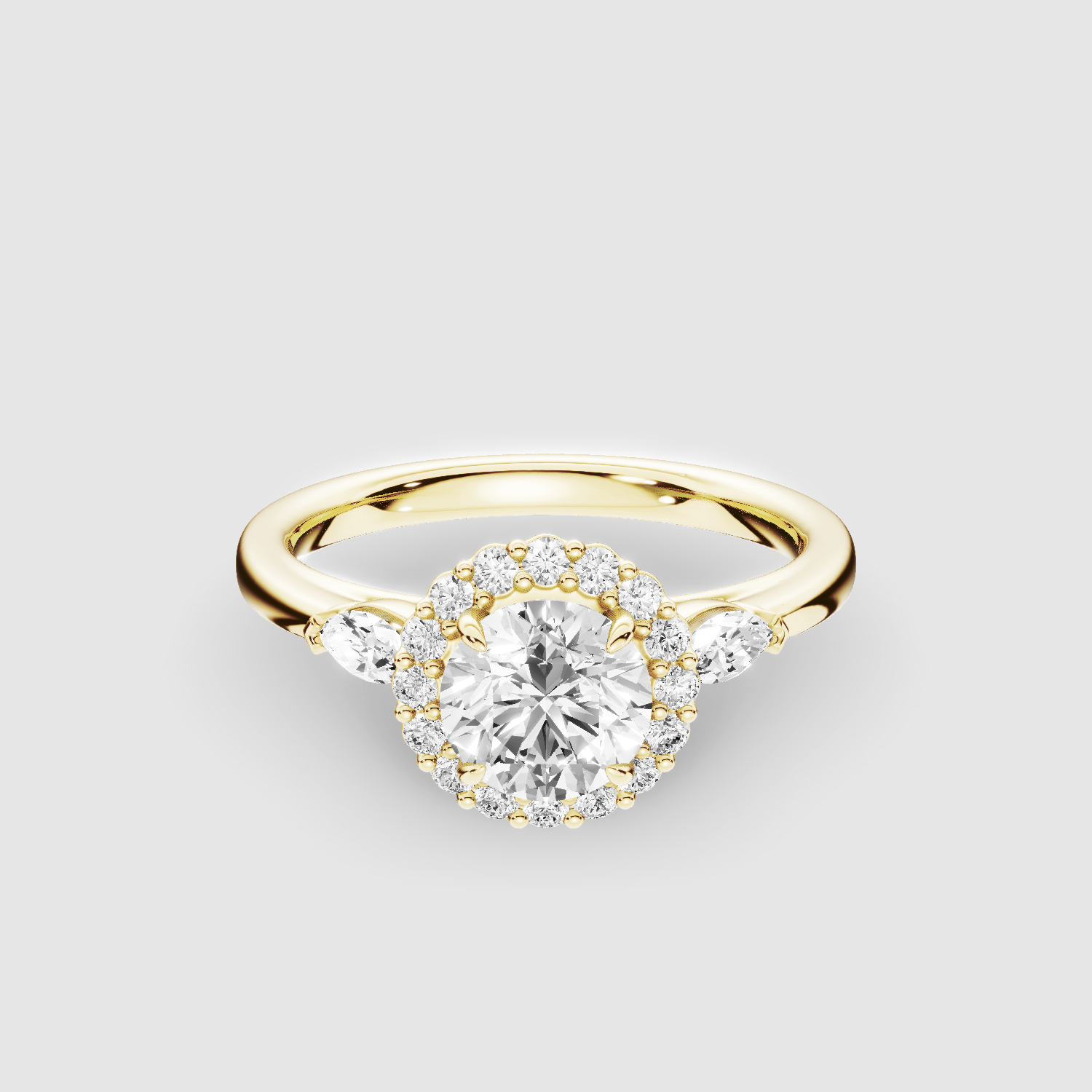 A brilliant-cut solitaire rests with marquise diamonds on either side in this lab-grown diamond engagement ring. The iconic 'Diana halo' and its shadow add glamour, while the slender gold shank enhances the delicate design.