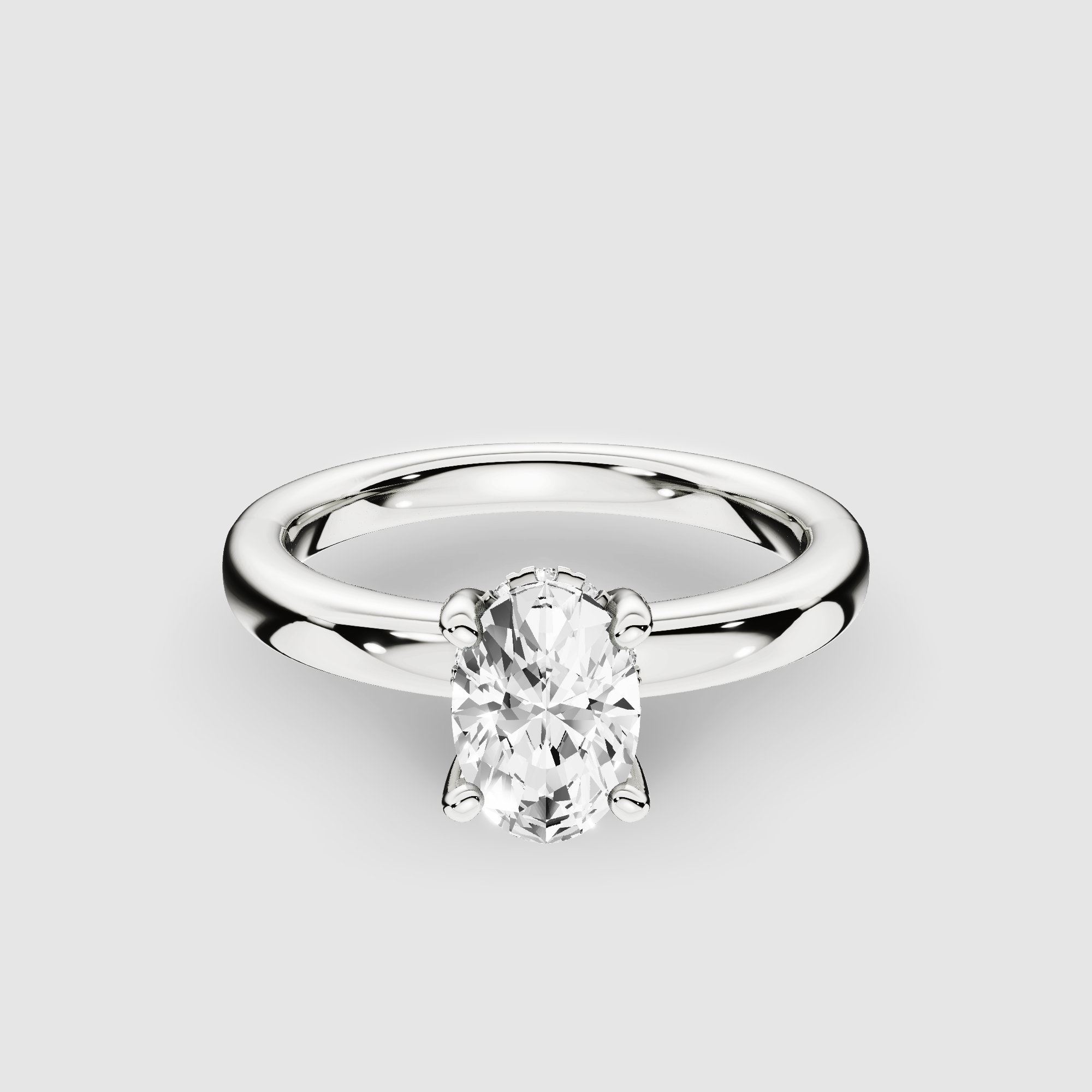 This classic engagement ring features a lab-grown solitaire on a slender, straight shank. The clean lines give the ring an air of refined beauty. A hidden halo of meticulously pave-set diamonds surrounds the base of the center stone, adding a subtle layer of sparkle that only reveals itself upon closer inspection.