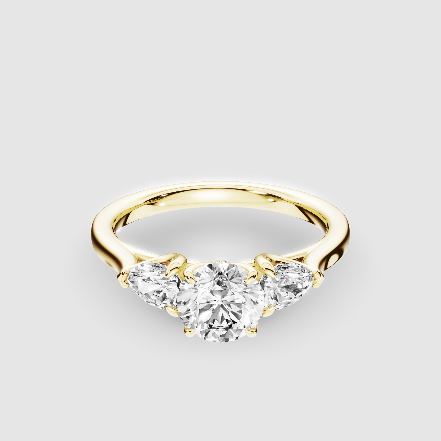 The sparkle of love is reflected by this three-stone, lab-grown diamond engagement ring. The central solitaire's appeal is enhanced by a pear-shaped diamond on either side. A hidden halo winks glamorously, adding radiance to the ring.
