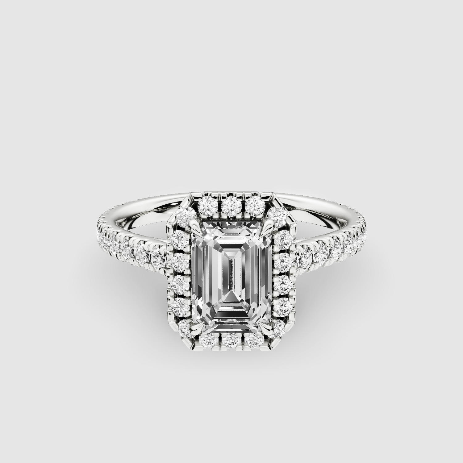 This glittering lab-grown diamond ring features split pavé set diamonds that encircle the central gem and adorn the band. The thin band creates a delicate and feminine look for a truly special wearer.
