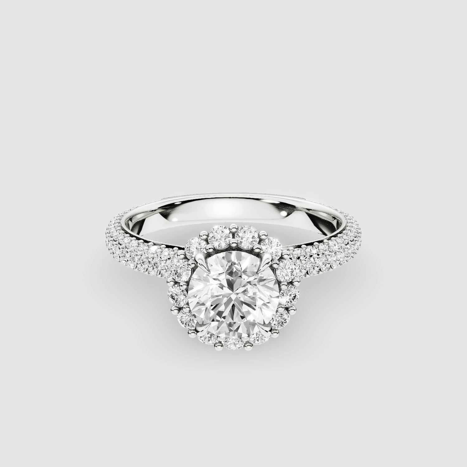 This dazzling lab-grown diamond engagement ring features a solitaire surrounded by the iconic 'Diana' halo. A micro-pavé set shank and hidden circle of diamonds create a subtle elegant and glamorous accent.