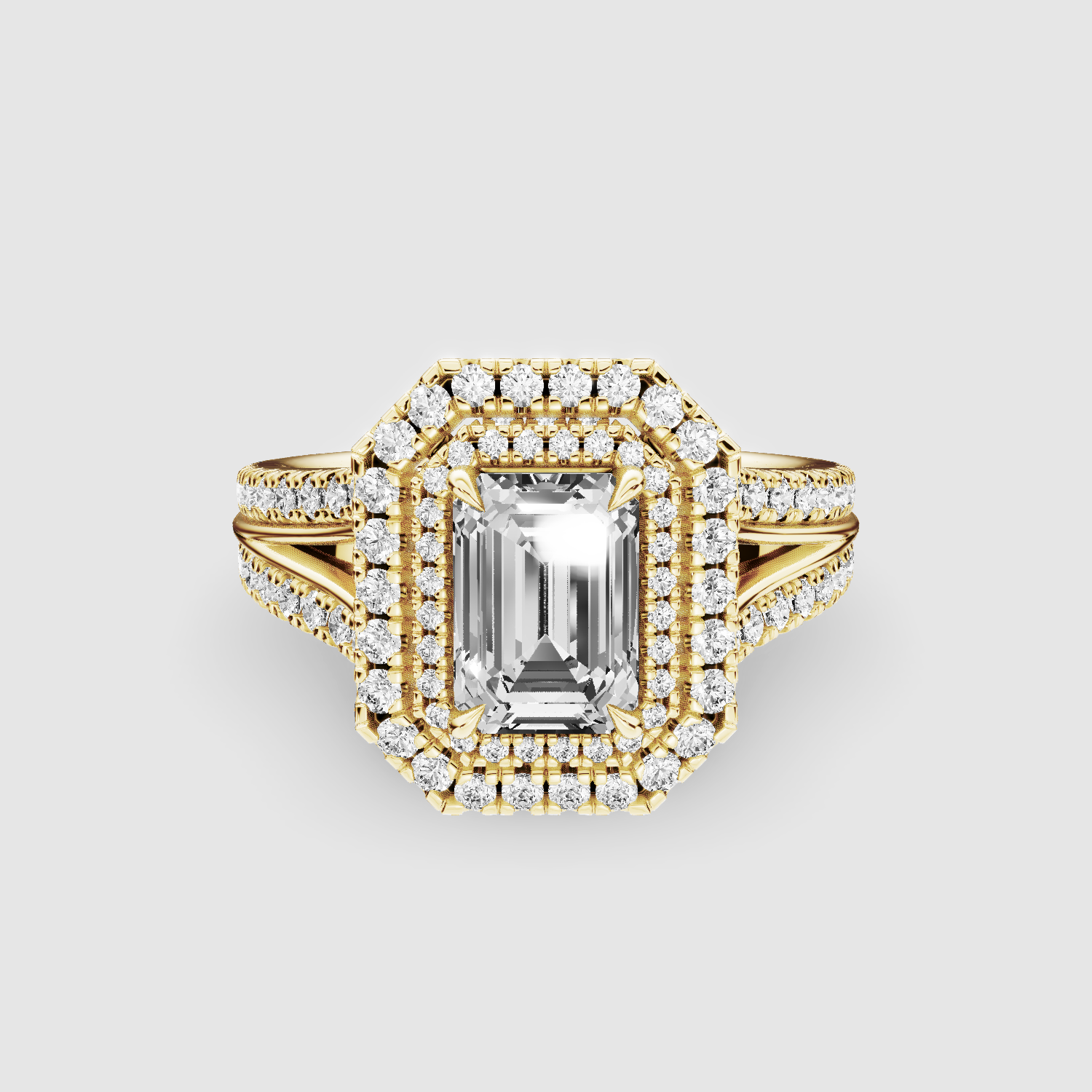 Two halos are better than one, especially for this lab-grown diamond engagement ring. The doubly embraced solitaire sits on a split shank, while a swish of gold adds a striking accent to the piece.