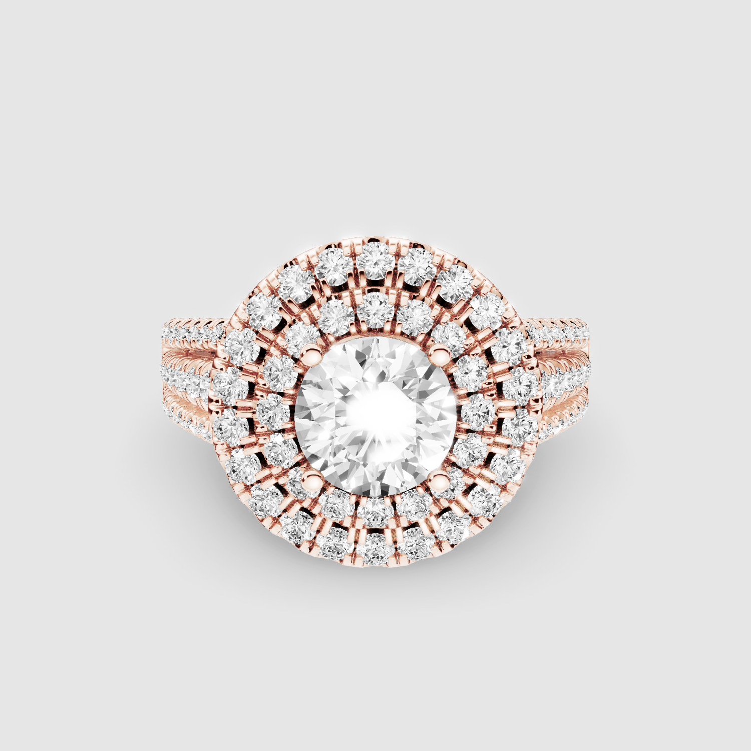 One solitaire diamond, two studded halos, and three diamond-encrusted rows of the shank – all lead to infinite radiance. This stunning solitaire engagement ring bears ethical, lab-grown diamonds to add to its shine. A gorgeous symbol of love and commitment for a very discerning REIGN woman.