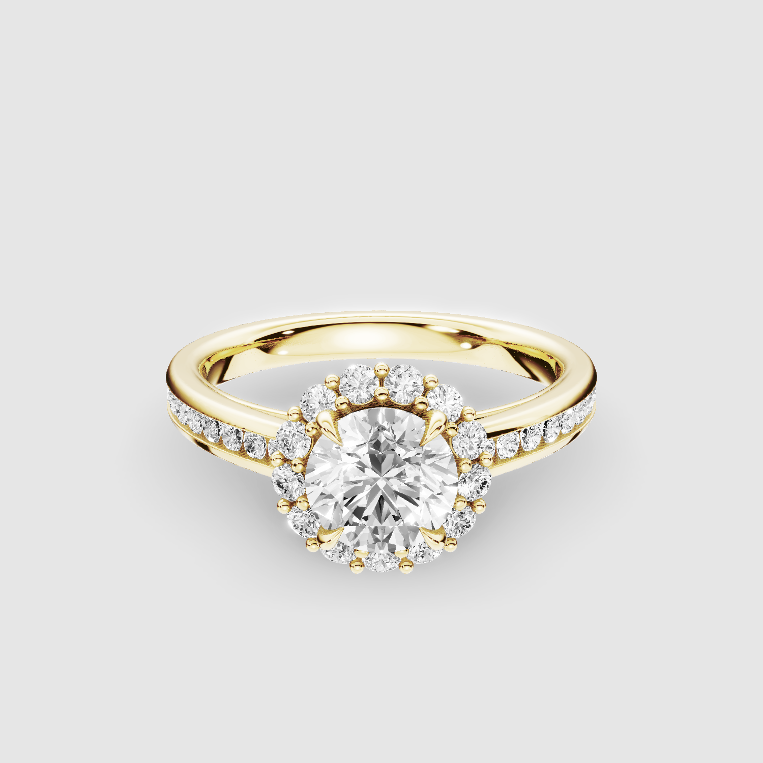 This timeless and romantic lab-grown diamond engagement ring features a brilliant-cut solitaire on a channel-set shank. The regal 'Diana halo' and its shadow make the ring shine radiantly, just like your true love.
