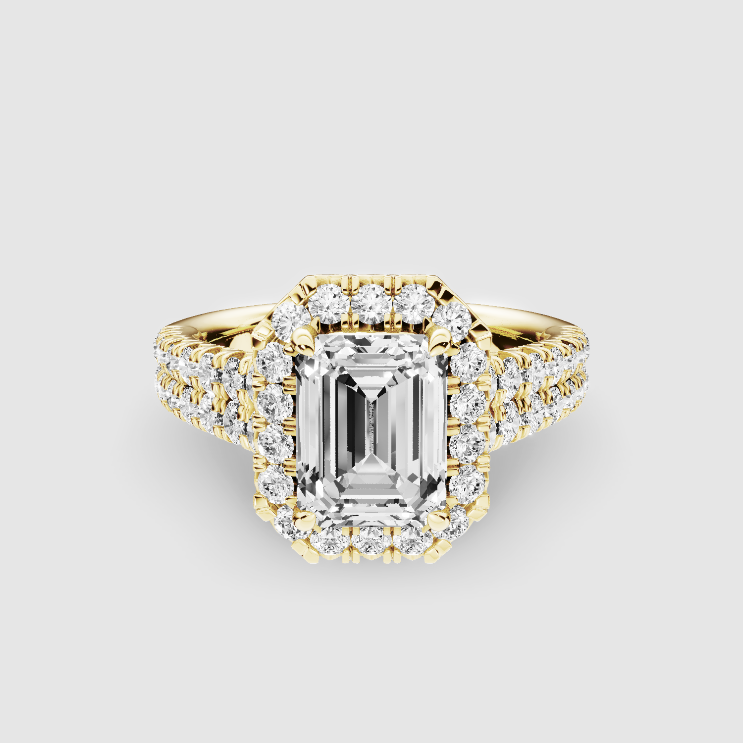 18K Yellow Gold | EF VS IGI certified | 3.00 ctw Emerald Cut Lab Grown Diamond 4 Prong Halo Ring