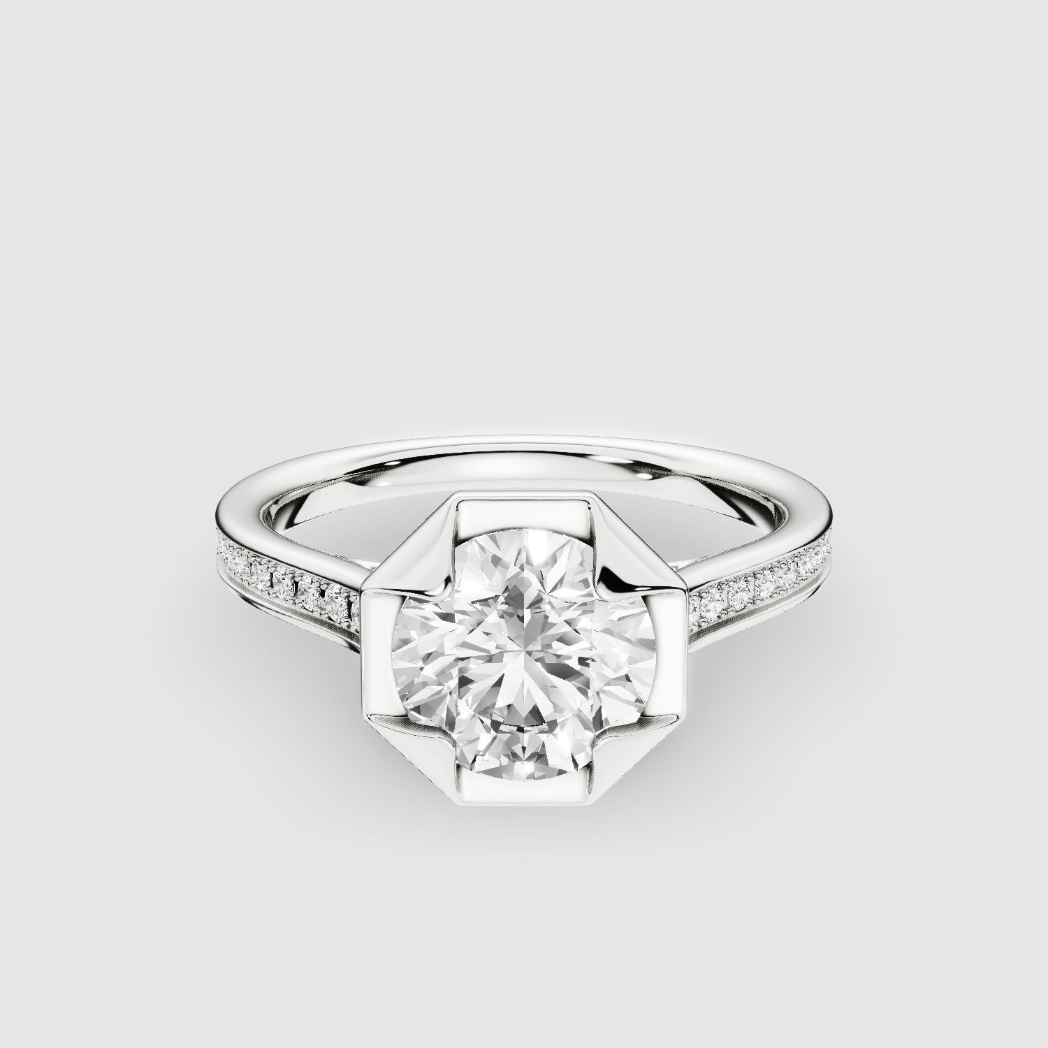 This lab-grown diamond engagement ring features a solitaire held with triangular prongs, surrounded by an octagonal bezel. The fine, channel-set shank allows a matched wedding band to rest seamlessly against it.