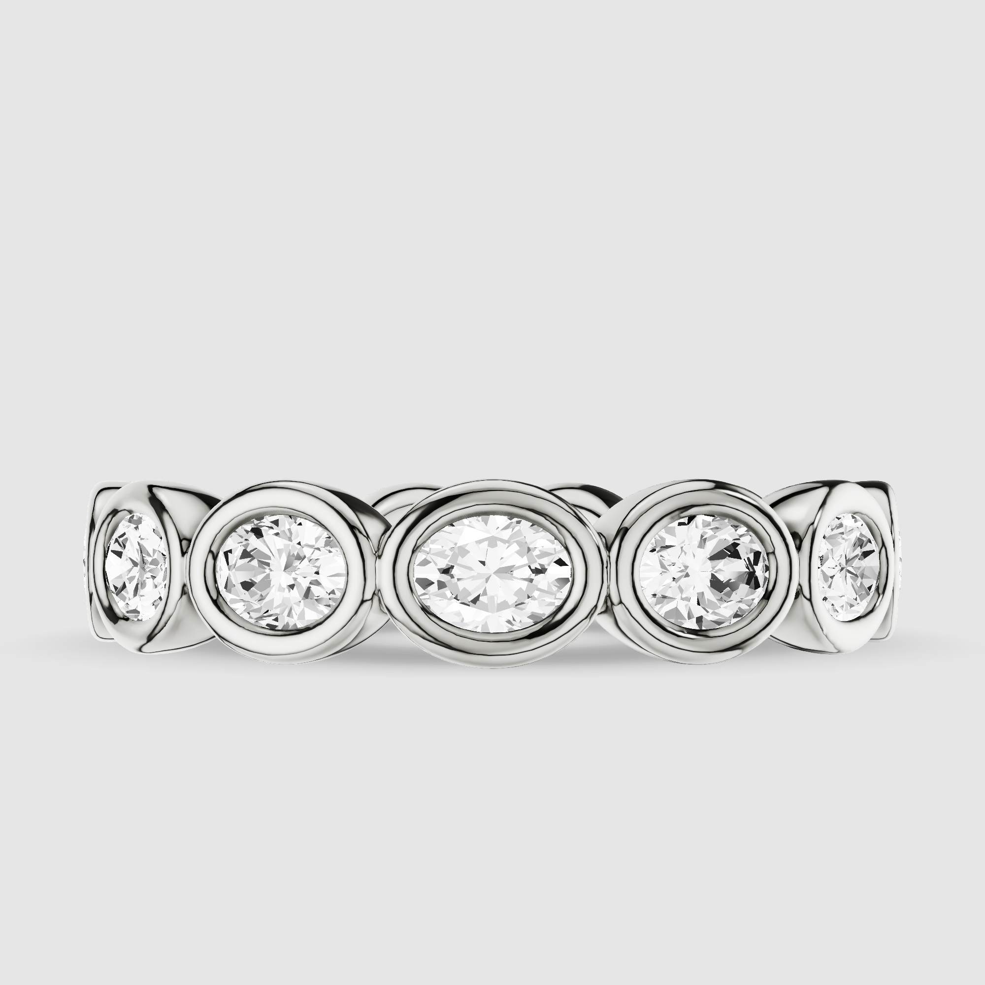 This full eternity band embodies the everlasting nature of love. Ethical, lab grown diamonds, meticulously set in a secure bezel setting, gracefully adorn the entire band in a captivating east-west design. The sleek and modern design, with its unique vertical setting, pairs well with a variety of styles, making it a conversation starter.