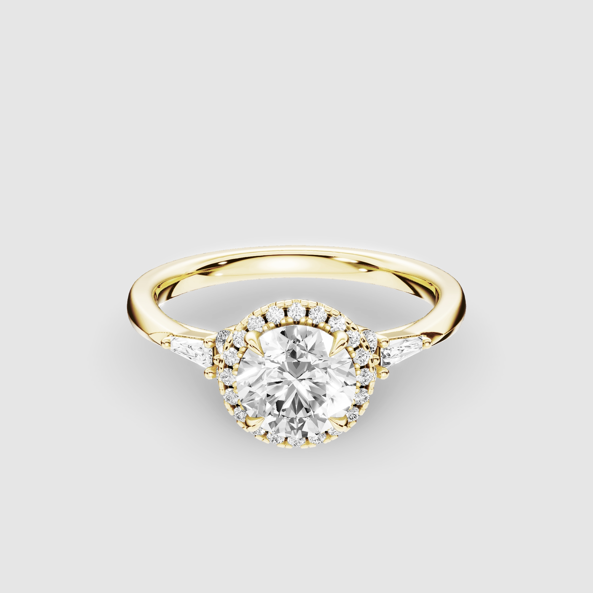 This lab-grown diamond engagement ring holds a haloed solitaire at its center. Round and baguette diamonds lie on either side to give it an air of contemporary romance.
