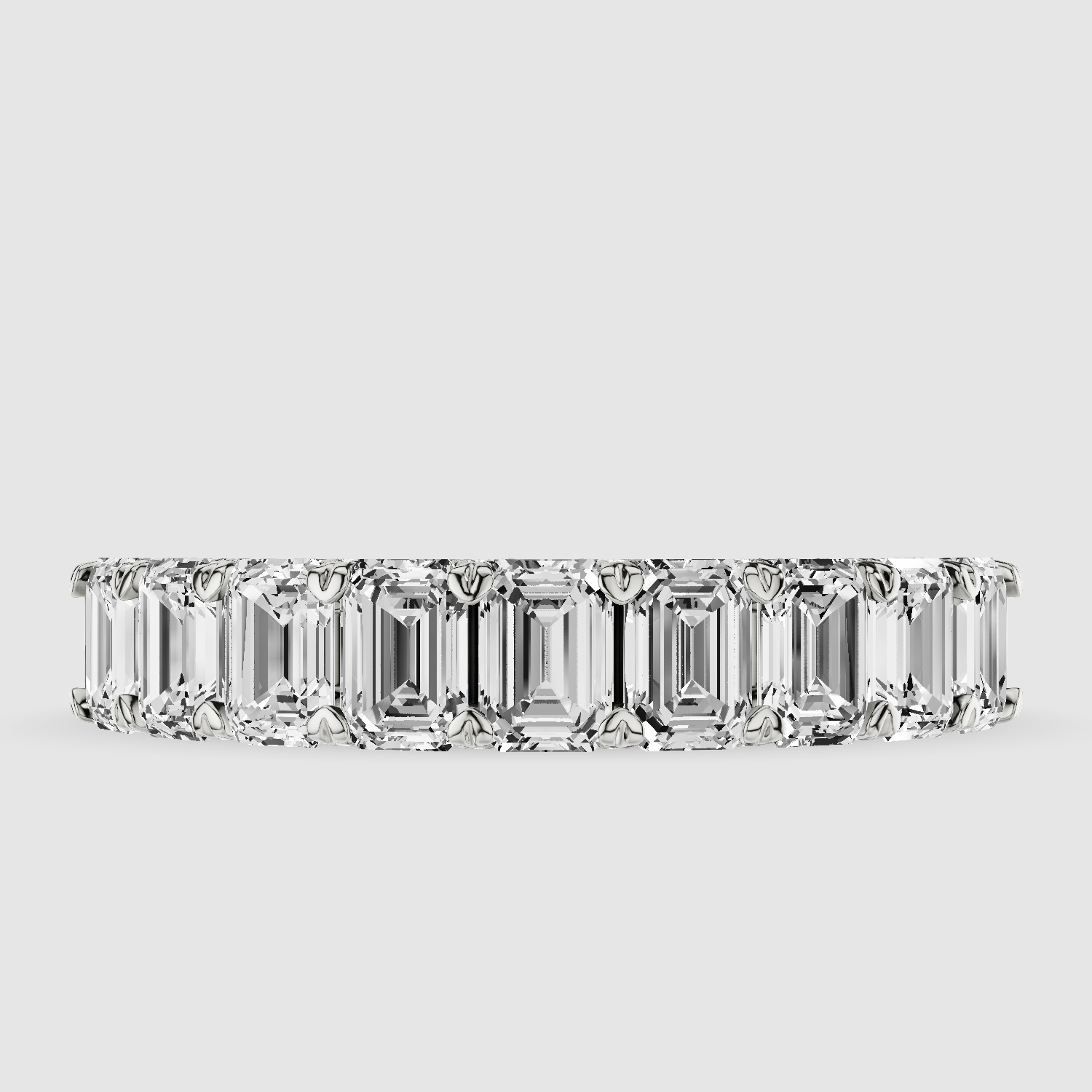 This lab-grown diamond half eternity ring is truly one-of-a-kind. It features an Emerald-cut mini solitaires with diamond-encrusted scallops along the sides. An uber glamorous ring that is designed to maximise the shine from every angle.