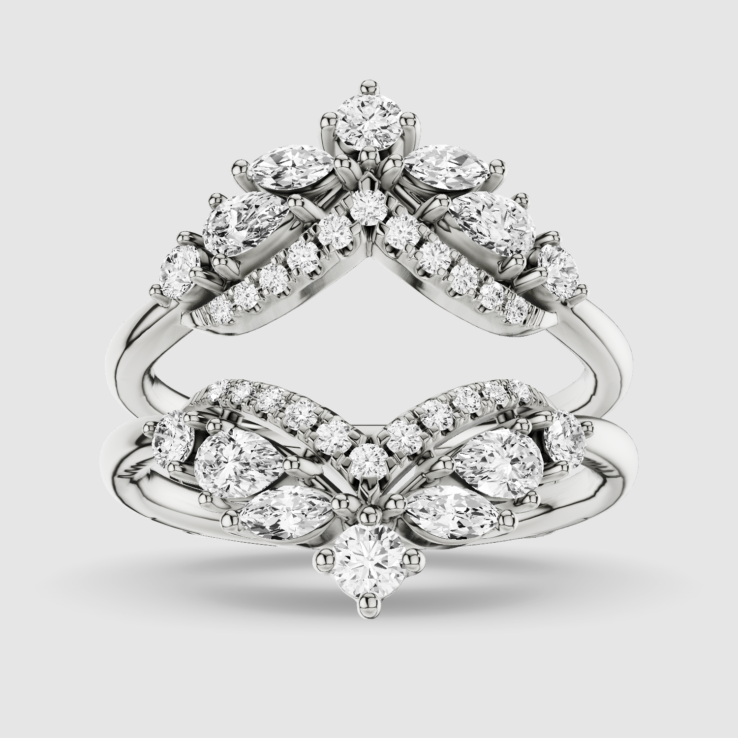 Turn that frown upside-crown! Each band of this wrap ring sports two rows of lab-grown diamonds in an elegant tiara formation. The bottom row bears round diamonds, while the upper layer holds pear and marquise diamonds too. Both bands rest slightly apart, allowing space for your engagement ring to fit in the middle. A perfect AM to PM piece to elevate any ensemble.