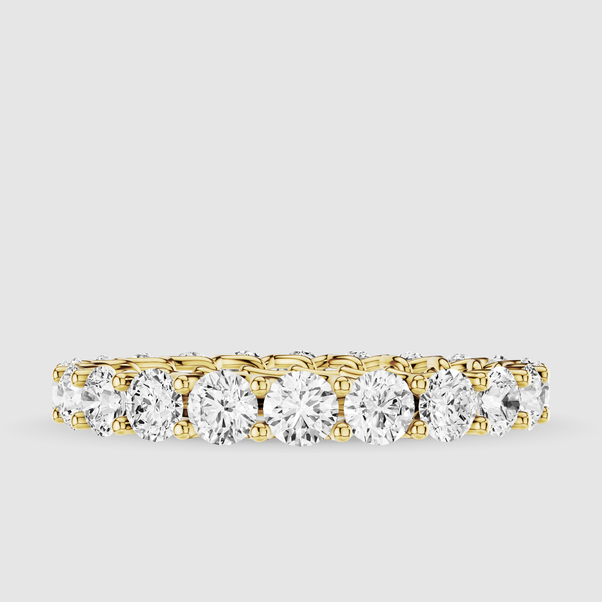 "Express your unwavering commitment with this sophisticated eternity band. Ethical, lab grown diamonds, meticulously set in a unique twisted prong setting, resemble vines that gracefully intertwine around the sleek plain shank. This enchanting design evokes a sense of organic growth and everlasting connection.